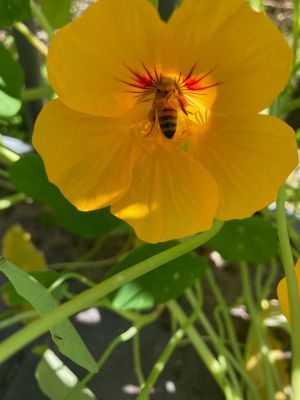 Trapaelum majus - the common Nasturtium - originated in the highlands of Peru but is happily adapted to conditions throughout the world. In our climate, it is a winter/spring annual. Nasturtium was taken to Europe from the "new world" by the Spanish in the 16th Century, along with potatoes and the tomato; and was viewed as an edible plant; in Europe it was commonly known as "Indian Cress". Its ornamental popularity exploded after it was used in gardens at the Palace of Versailles - making the humble Nasturtium incredibly fashionable! In Victorian flower language, Nasturtiums symbolise patriotism, loyalty and strength - victory in conquest & perseverance. You probably know that both the leaves and flowers of Nasturtium are edible - but I've looked into a few more facts that I hope you enjoy learning about its uses and benefits. Nasturtium has been used medicinally for centuries internally and for cuts and scrapes - it is high in Vitamin C, minerals, antioxidants and natural anti-bacterial and anti-inflammatory compounds. It is said to help with respiratory issues, acne and digestive issues. One anti-inflammatory compound is Lutein (and nasturtium has one of the highest amounts of this of any plant) which can help with eye and skin health. Making a tea by steeping crushed leaves and flowers is a great way to create a natural face or scalp wash, as well as drinking it for sore throats and colds. (As always, use herbal/plant remedies with caution and discuss with a medical professional if you're taking medication, pregnant or concerned.) As a companion plant, Nasturtium has been shown to make a great decoy crop - particularly for caterpillars that love brassicas. Plant near but not right next to your broccoli, kale or cauliflower, and the adult moths will lay eggs on the Nasturtium plants instead; and they'll happily chomp away and (hopefully) leave your crops alone. Nasturtium also attract whitefly and aphids - so they're a good crop to grow around your roses, citrus or other plants plagued by these pests. Keep an eye on the pest numbers on your Nasturtium plants and treat or remove if the numbers build up to a level that will threaten your beloved plants. Nasturtium flowers will attract beneficial insects and pollinators to your garden; which is another great reason to allow them to stay and thrive. Allowing them to sprawl under and around fruit trees will have multiple benefits - providing both the trees and Nasturtiums have adequate moisture and nutrients to thrive. Nasturtium will outcompete many other, smaller weeds, and act as a living mulch, encouraging beneficial microbial activity in the soil.